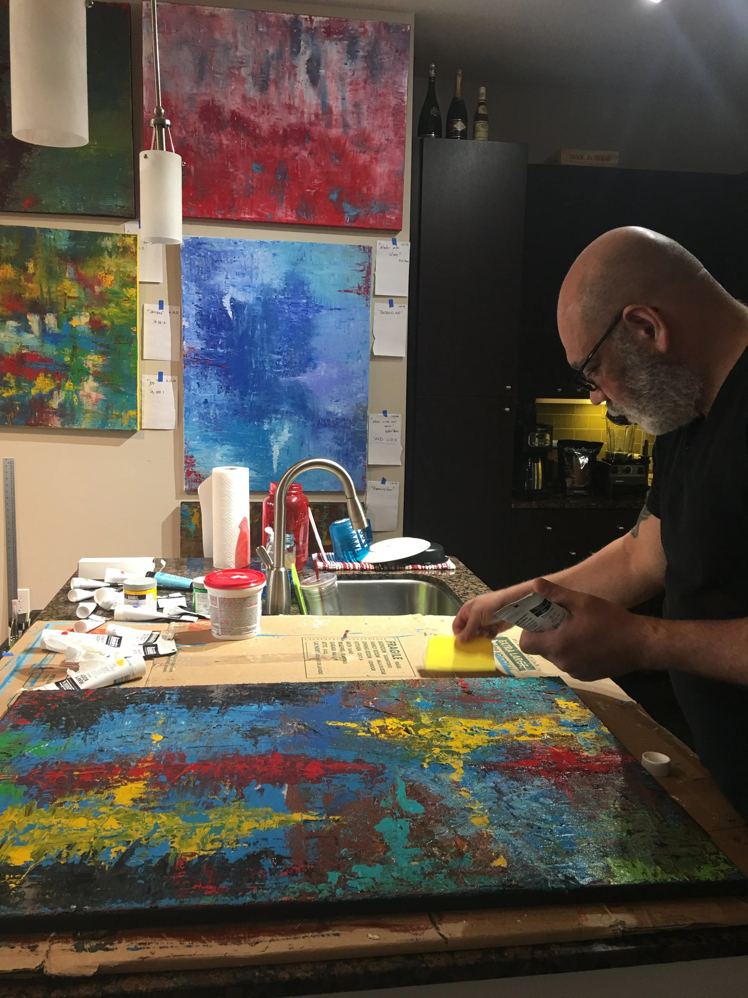 He approaches each canvas with no preconceived idea of how the final piece will look. Every painting becomes a journey guided by intuition, ending in a destination revealed along the way. His work is known for its vibrant colors, layered textures, and the depth and life that emerge from each piece.